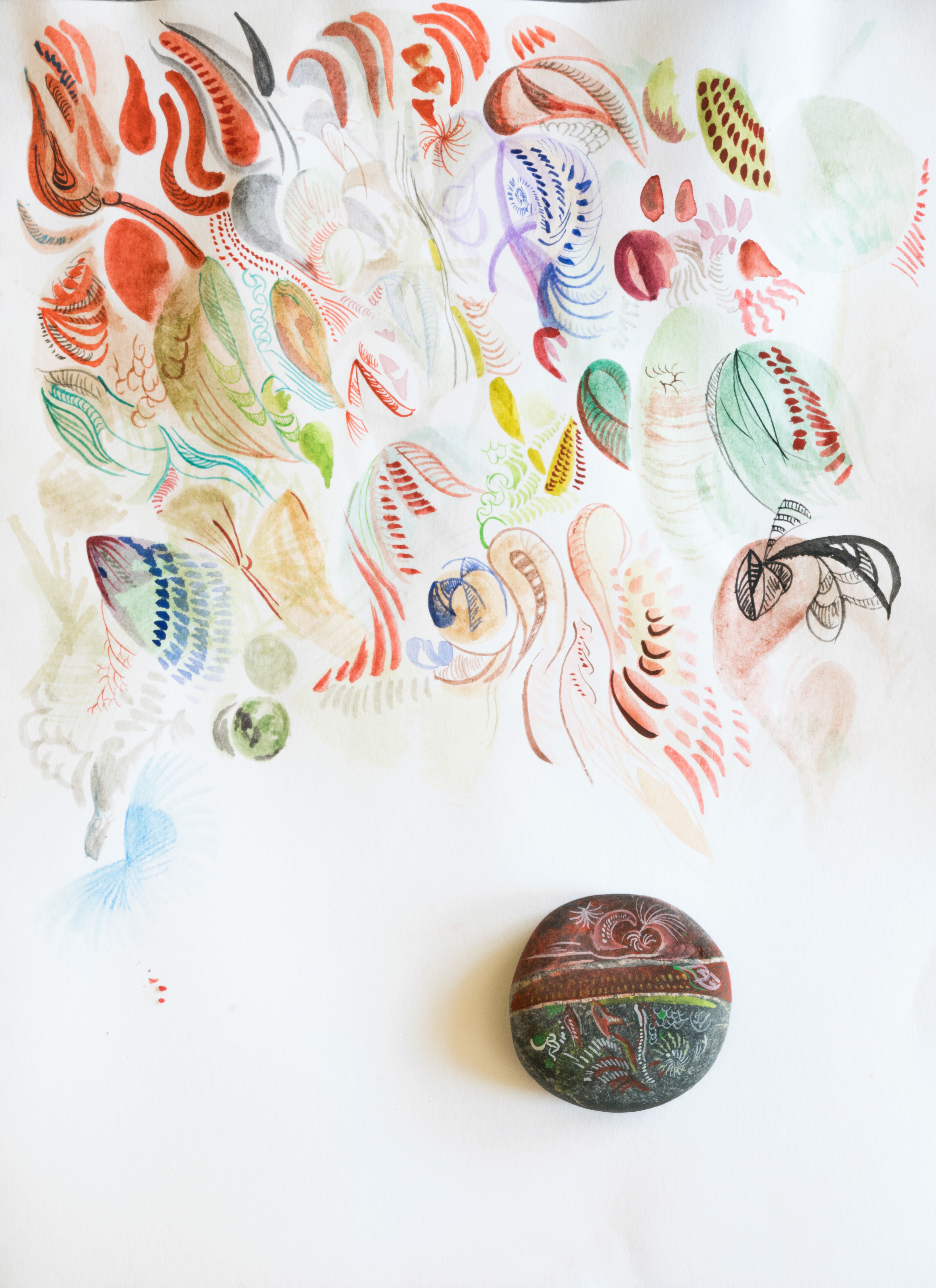 A miniature installation: one pebble covered with watercolour pigments rested upon a watercolour painting, with which visual adventure expresses and concludes my sensation of the pebble's passage of time in the form of automated colour drawings